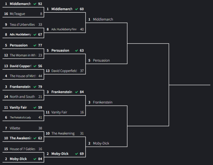 The Elite Eight was a testament to good seeding. There were no upsets! Every higher ranked book defeated the measly book beneath it. After an early lead, The Adventures of Huckleberry Finn collapsed beneath the weight and might of the titular Middlemarch, which received 60 percent of the vote. The same easy wins were afforded to Persuasion, who beat David Copperfield with 63 percent and to Moby-Dick, who beat The Awakening with 69 percent. Nice! Sperm Whales! The true blow-out came from Frankenstein, who annihilated Vanity Fair by a monstrous margin.