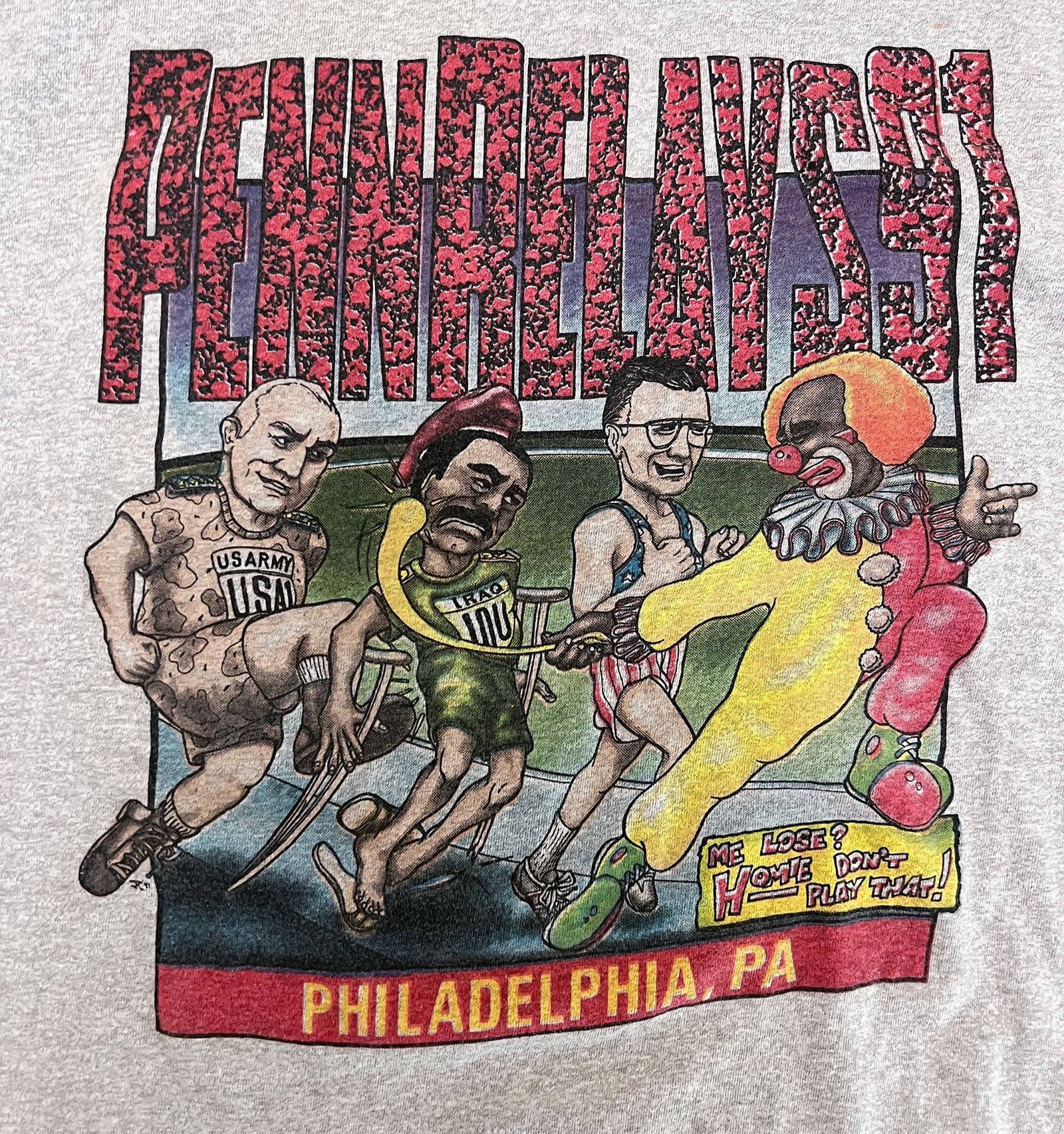 I have a collection of official shirts and bootleg gear for a lot of Philadelphia sports. Many are unhinged; I have a shirt that accuses Ben Simmons of storming the Capitol on January 6. But no shirt is stranger than the one I have from the 1991 Penn Relays. It features Norman Schwarzkopf, Saddam Hussein, George H.W. Bush and Homey the Clown. They’re all on a track in a line like they’re doing line running in training. Saddam is on crutches. Schwarzkopf is kneeing him in the ass. Bush is just running. And Homey the Clown is turned around, whipping Saddam with a loaded sock. “Me lose?” the shirt reads. “Homie don’t play that.”